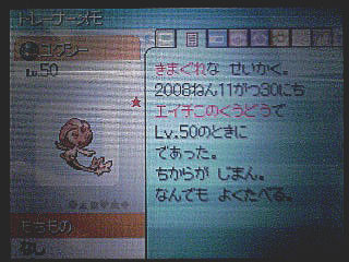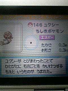 ユクシーの技は、あくび・スピードスター・みらいよち・ドわすれなのですが、どれもPPの多い技で助かった。ギラティナ級のPP数だったら、とっくに悪あがき→自滅コースに突入してたかと思われ。一応、ヒメリをなげつけるドーブルは連れて行っていましたけども。